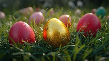 Vibrant easter eggs on lush grass with shiny golden egg for spring celebration