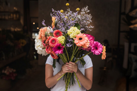 Smiling florist in urban flower shop with colorful bouquet display