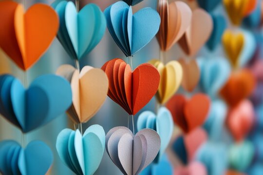 Colorful folded paper hearts hanging on strings, creating a festive and romantic atmosphere