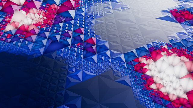Colorful Futuristic Surface with Triangular Pyramids. Illuminated, Blue and Pink Polygonal 3d Texture.