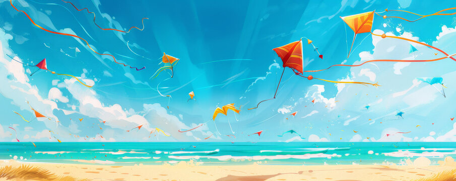 children flying kites at seaside colorful kites clear blue sky happy expressions