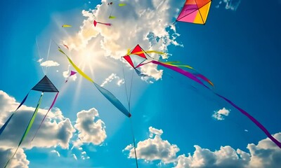 Skyward Symphony: An animated depiction of a lively cityscape, where colorful kites dance against a vibrant, sunlit sky, a scene of joy and community spirit.