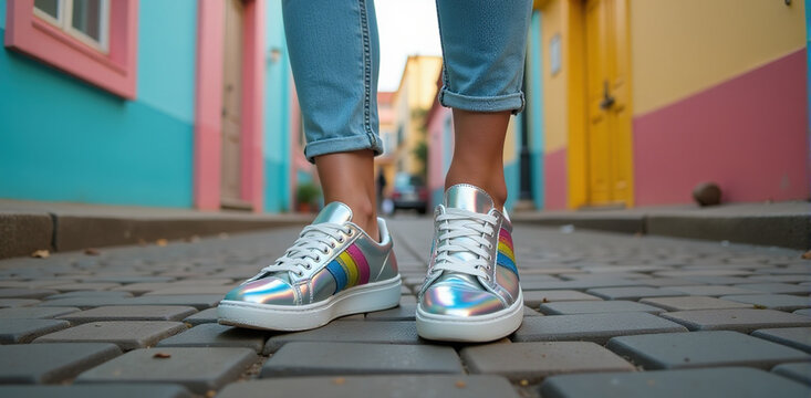 Closeup of woman's feet in silver rainbow sneakers on a colorful cobblestone street.