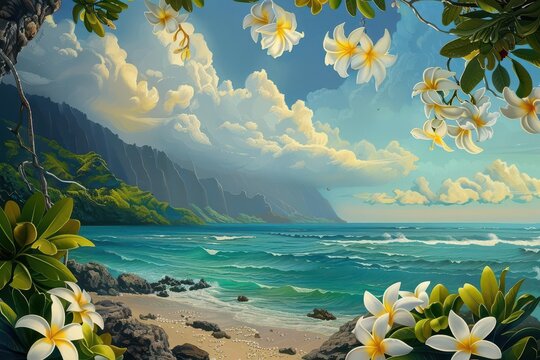 Hawaiian lei celebration featuring tropical flowers and leaves design for festive occasions. Horizontal banner. Copy space. Flat illustration. International day of the tropics