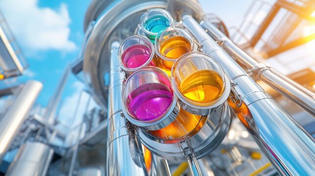 Colorful liquids in laboratory glassware and metal pipes