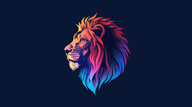 Vibrant, stylized lion head profile, colorful mane, dark background.