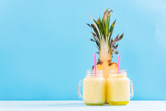 Bright Colorful refreshing summer drinks in glass jars and straws isolated on a white background