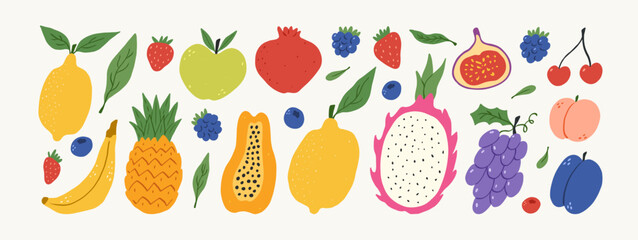 Hand drawn colorful fruits and berries. Abstract funny doodle style. Natural tropical fruits. Lemon, cherry, apple, peach, banana, strawberry, pineapple, fig, dragon fruit. Vector illustration.
