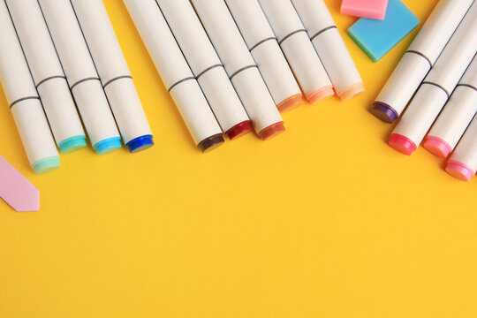 3d A set of colorful felt-tip pens arranged in a rainbow pattern on an artist's canvas