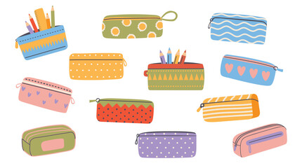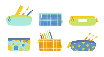 Set of pencil cases. Collection of school pencil cases in flat style. Vector illustration.