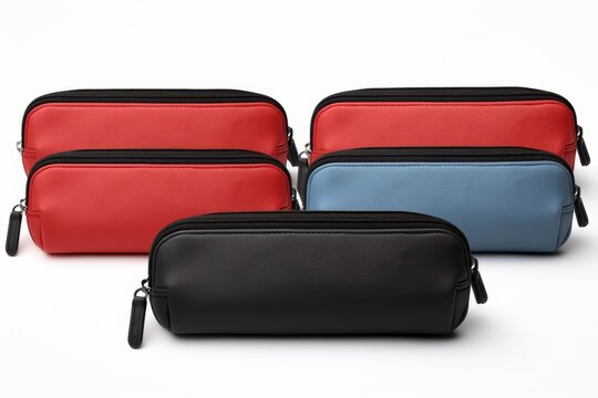 A sleek leather pencil case with a zipper, placed on a pale blue background, alongside an open pen holder filled with colorful stationery, captured in a professional studio setting.