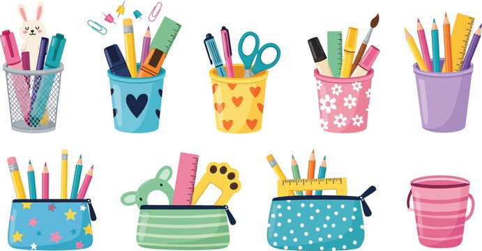 Back to school supplies vector illustration with pencil holders and pencil cases for students editable