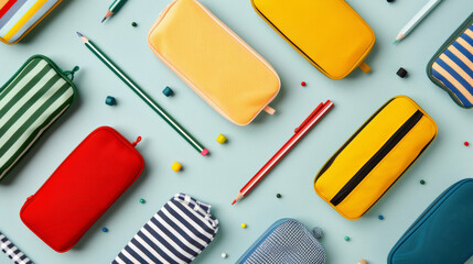 Colorful pencil cases on desk, classroom background, back to school