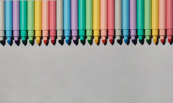 Studio shot of row of colorful felt tip pens lying against gray background