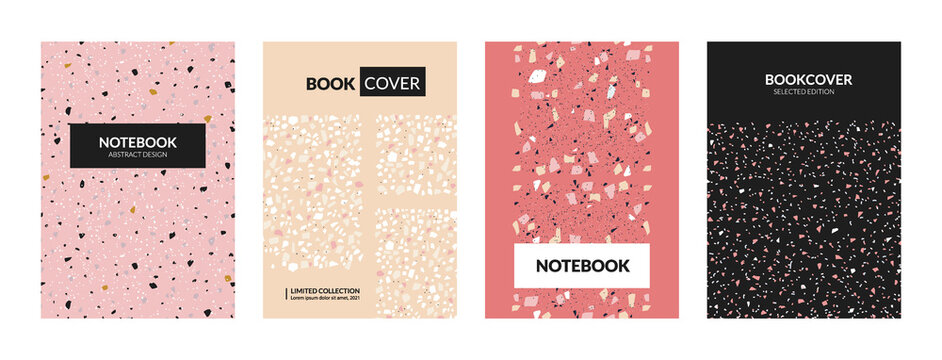 Terrazzo book cover. Abstract Italian concrete textures for notebooks. Marble stone mockup with chaotic particles and splinters. Vector decorative copybook pastel design templates set