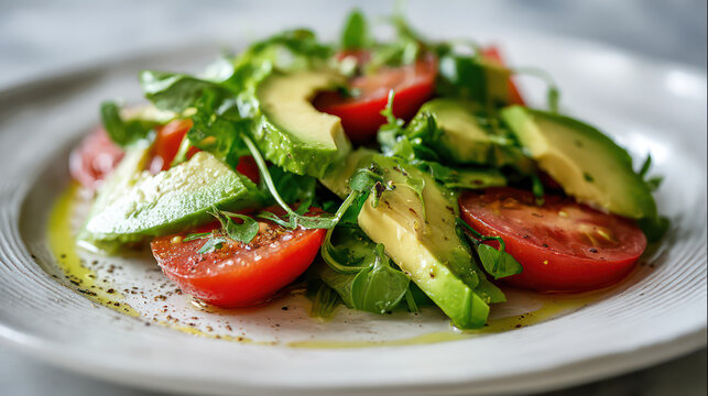 Fresh green salad with avocado tomato and olive oil healthy and colorful served white plate close up vibrant nutritious