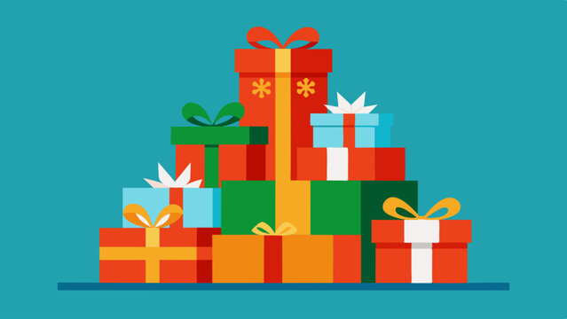 Colorful illustration of a stack of gift boxes in various sizes and colors with decorative ribbons.