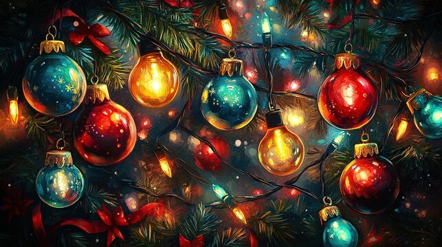 A blurred background of colorful bokeh lights in shades of blue and orange. The scene creates a festive and vibrant atmosphere.