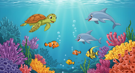 Cartoon underwater scene with coral reef and colorful fish playful dolphins and sea turtle ideal for childrens projects