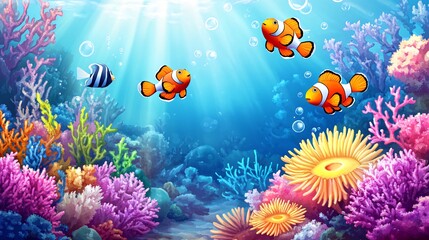 A vibrant underwater scene featuring colorful corals and clownfish, showcasing the beauty of marine life in a coral reef habitat.
