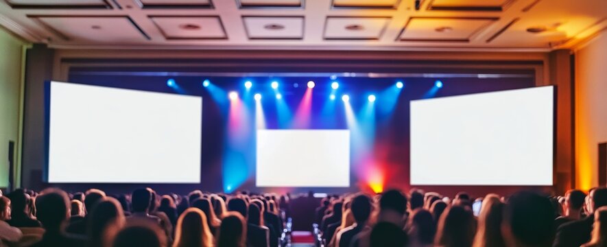 Business conference hall with two large blank white screens, colorful lights shining from above, and an audience watching the stage presentation, creating a professional and engaging atmosphere.