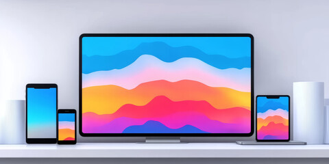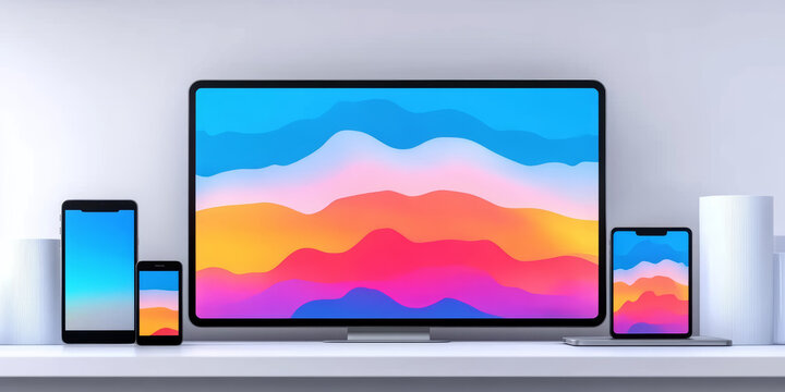 A desktop computer, tablet, and smartphone all display the same colorful abstract wallpaper.