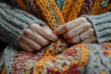 Senior woman's wrinkled hands with ring holding colorful knitted wool blanket or shawl in warm autumn colors. Close up view showing texture and craftsmanship.
