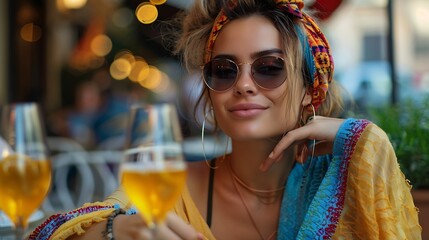 Woman eating italian pasta and drinking wine at restaurant on the street in Rome Concept of Italian gastronomy and travel Stylish woman with sunglasses and colorful hair shawl : Generative AI
