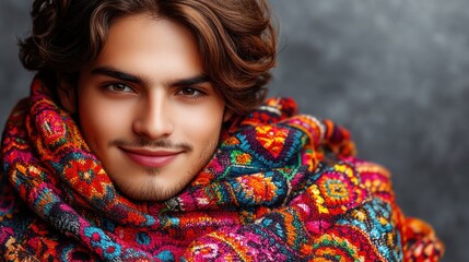 A smiling young man in a colorful shawl radiates charm and warmth