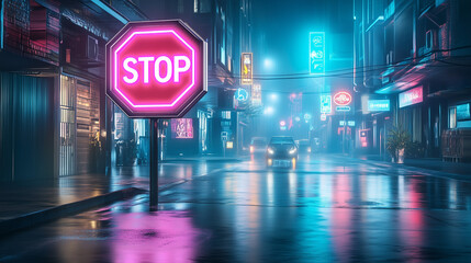 Neon stop sign glowing in empty urban street at night