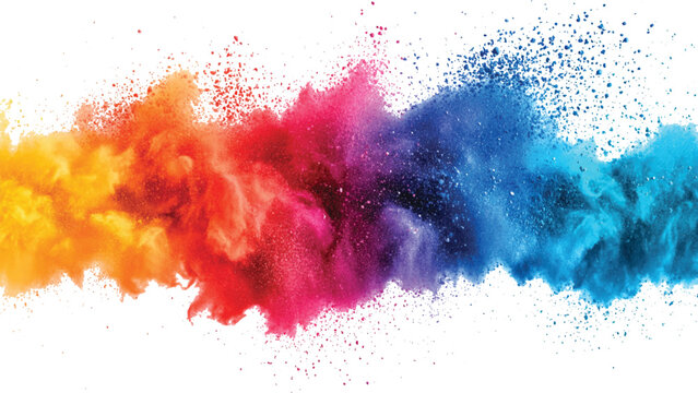 Abstract colorful splashes on white background. Generative AI illustration with paint powder explosion effect. Artistic blend of colors like blue, pink, orange, yellow. Modern design element,