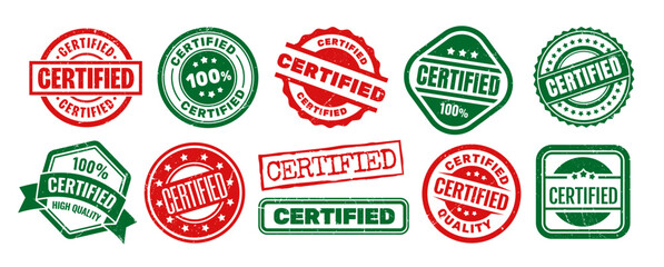 Colorful Certified Seals Set. Bright stamp templates or hand drawn icons with inscription Certified. Design Elements for Product Packaging. Flat vector illustration collection isolated on background