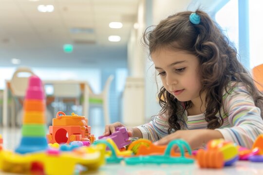 A young child is having fun playing with colorful plastic blocks