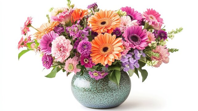 A colorful vase filled with an assortment of flowers rests on a bright white background.