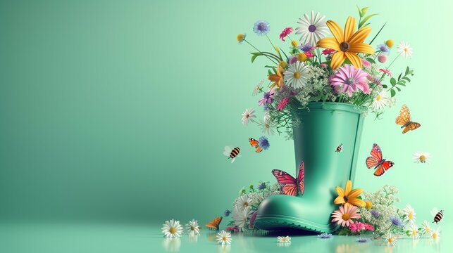 Green rubber boot full of colorful spring flowers with butterflies and bees on mint green background. Spring is here concept. 3D Rendering, 3D Illustration