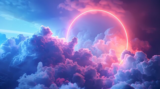 colorful neon ring glowing inside the stormy cloud on the blue sky