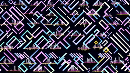 An abstract, geometric pattern with colorful lines, shapes, and signal