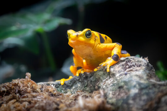 Poised and full of poison, a Yellow Banded Poison Dart Frog (Dendrobates leucomelas) squats on a log. Vibrant against a dark, muted jungle scene. Colorful skin is a warning sign to predators.