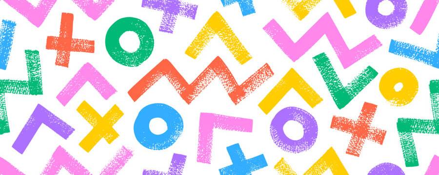 Multi colored geometric shapes seamless pattern. Brush drawn scribble zigzags, circles, triangles and crosses. Vector ornament with various chaotic brush drawn colorful geometric figures.