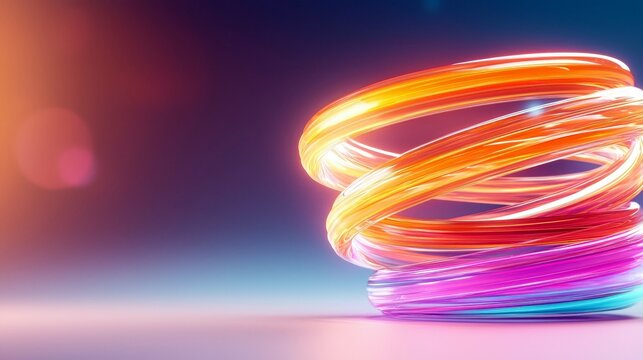 A stack of vibrant, glowing, intertwined rings in neon colors like orange, pink, and blue, set against a soft gradient background with blurred lights.