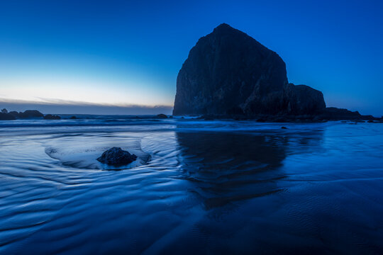Haystack Rock in cold winter dusk blues at Cannon Beach