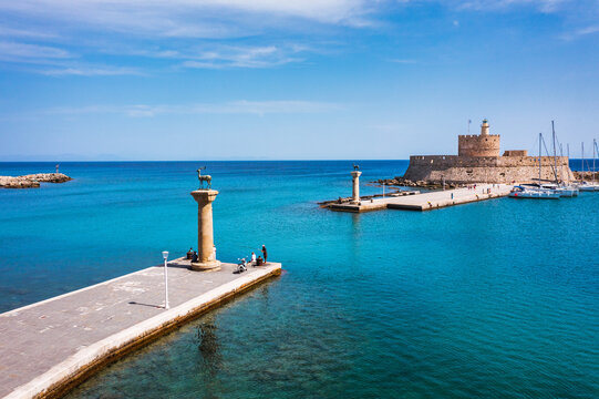 Mandraki port with deers statue, where The Colossus was standing and fort of St. Nicholas. Rhodes, Greece. Hirschkuh statue in the place of the Colossus of Rhodes, Rhodes, Greece