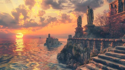 Realistic sunset photo of colossus of rhodes by the sea in ancient greek cityscape