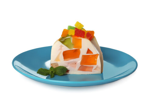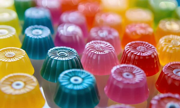 Delicious Red yellow jelly adorned with raspberries. Sweet fruit dessert. For use in culinary websites, food blogs, catering services, recipe books, and dessert menus. Light blurred background.