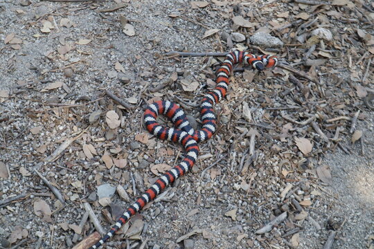 California Mountain Kingsnake Lampropeltis zonata in the wild on hike path in Idyllwild San Jacinto mountains california