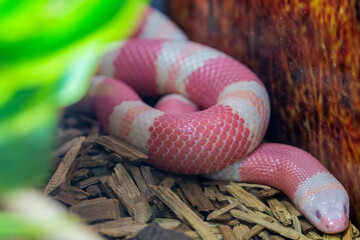 the closeup image of albino pueblan milk snake (Lampropeltis triangulum campbelli). an egg-laying subspecies of non-venomous colubrid snake. It is commonly bred in captivity.