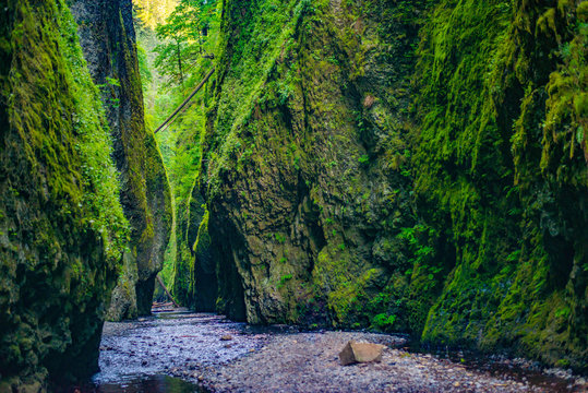 Mountain range illuminated by the oblique rays of the setting sun on the banks of the Columbia River in Colombia Gorge