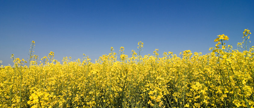 Yellow rapeseed field against blue sky background. Blooming canola flowers.