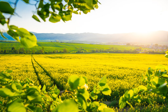 Amazing green and yellow rape spring fields Landscape. Agriculture Rural scene. Czech Moravia colza canola farmland bloom. Hunting box on Sunny waving hills.