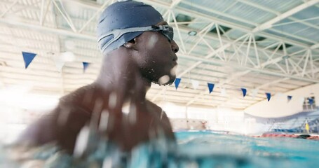 Man, loser and angry in swimming pool for sports, splash and disappointed with performance at global contest. African person, athlete and sad with stress, fight and upset at international competition